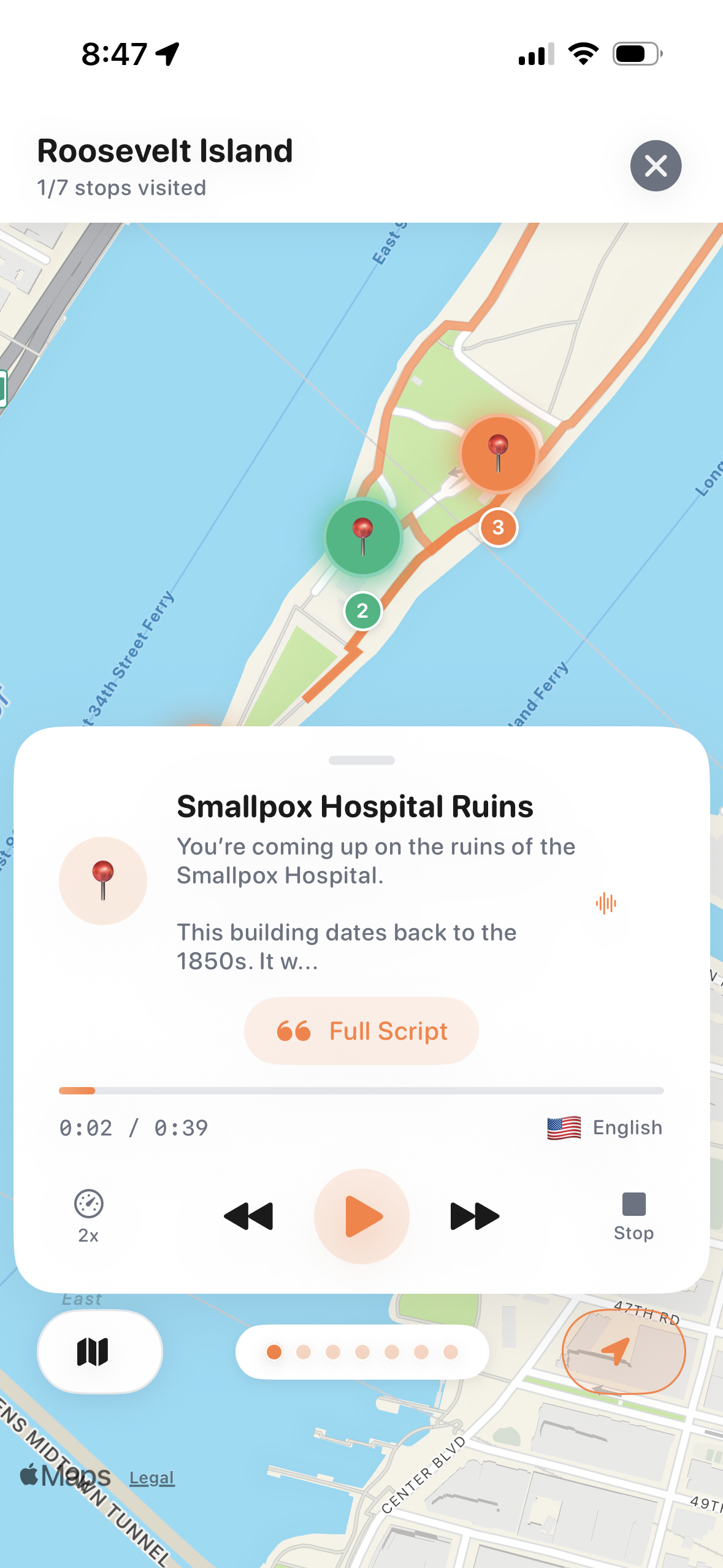 AI-generated Roosevelt Island tour with stops, narration, and route